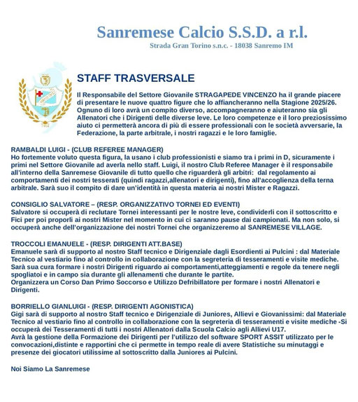 La Sanremese Calcio è lieta di annunciare un nuovo tassello al suo progetto di rilancio:  Paolo Schiavone, tennista professionista ed influencer sportivo tra i più seguiti in Italia, entra ufficialmente in organigramma, con un ruolo chiave nel marketing e comunicazione. Con oltre 300.000 follower sui social e milioni di visualizzazioni sui suoi contenuti, Schiavone è uno dei tennisti più seguiti in Italia e una delle figure emergenti nello sport internazionale e, grazie alle esperienze in questo mondo ed alle competenze in branding e social media, sarà il motore per nuove strategie innovative.  Paolo affiancherà Lorena Ferrari ed entrerà nel team che dovrà riportare passione, entusiasmo e visibilità attorno alla squadra.  Rilanciare il brand Sanremese trasformandolo in un punto di riferimento non solo calcistico ma anche mediatico, in grado creare nuove generazioni di tifosi, creando nuovi eventi per attrarre sponsor. Già noto il progetto sportivo, dove, grazie all'ingaggio di Del Piero, Djorkaeff e Gattuso e ad una squadra nuova e con un mix di giovani e giocatori esperti di alto livello, la Sanremese Calcio non nasconde le ambizioni per il salto nella categoria superiore.  Con l'arrivo di Paolo Schiavone si arricchisce il team per puntare ad un posizionamento unico in Italia: unire sport, spettacolo, comunicazione digitale per far vivere la Sanremese dentro e fuori dal campo in ogni giorno della settimana. "Questa non è solo una squadra di calcio - dichiara Schiavone - è una storia che merita di essere raccontata nel mondo. Vogliamo far innamorare di nuovo Sanremo della sua Squadra e, allo stesso tempo, proiettarla su palcoscenici nazionali ed internazionali".